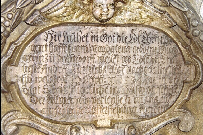 = Kirche zu Kraig, daselbst ihr Epitaph mit den Wappen Wucherer (geviert, 2 Helme) und Kurzleb. Die Inschrift lautet:"Hie ruhet in Got die Edleh en tugenthafft fraw. Magdalena geborne Wuechrerin zu Dräsendorff, weilet des Edle un Ernueste Andree´ Kurzlebs selige und nachgelaßne Witwe welche de 30. Octob: im 1548 Jahr in der Stat S.Veit, seligeliche in Christo ist verschide. Der Allmechtig verleyhe Ihr un uns alle ain fröliche Aufferstehung. Aman"